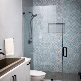In the main bathroom the wall separating the vanity from the shower and toilet was removed. A fun mix of tiles installed and a new custom vanity accommodating a hand poured concrete trough sink.