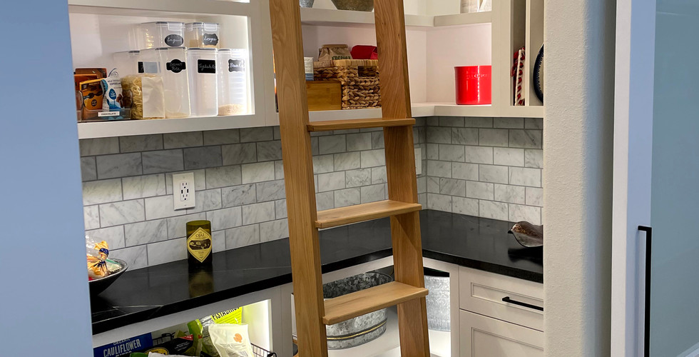 The walk in pantry needed to house all sorts of miscellaneous kitchen items, we combined open and closed storage options utilizing the ceiling height for maximum storage and for fun (and to reach the stuff on the top shelf) we brought in a rolling ladder! Marble sunway tile, soapstone counters and LED lights allow this space to shine.