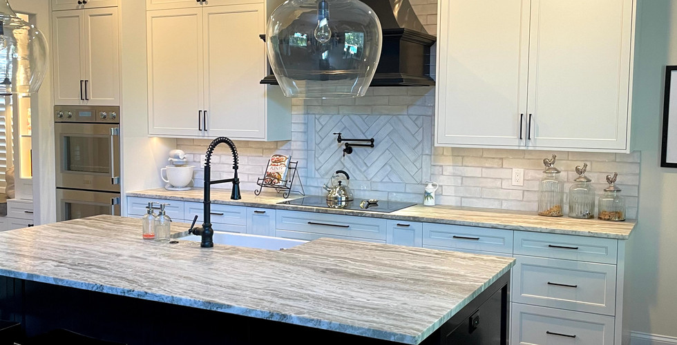 Leathered marble countertops, top of the line appliances, black fixtures, and lots of lighting all lend their hand to bring the WOW factor!