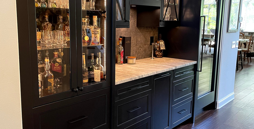 The client wanted this bar to pack all the essentials needed to host a great party. With decorative display space, closed storage below, pull out trash and recycling bins, a fresh water tap and integrated wine fridge, they're ready to do just that.