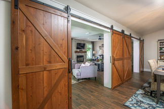 The double set of barn doors drives that farmhouse feel home, it brings in more warm woods while lending the ability to separate the living spaces when the clients choose.